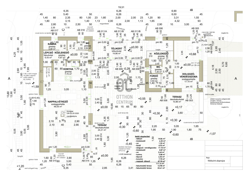 - teraszok burkolata: kerámia, vörösfenyő, travertin mészkő