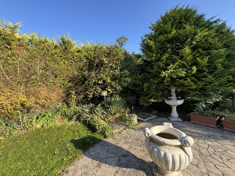 A parkosított, örökzöldekkel és díszcserjékkel beültetett kert a ház méltó folytatása.