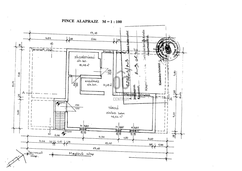 A pince teljes gépészeti háttérrel felszerelt, itt kapott helyet a gáz- és vegyestüzelésű kazán, valamint egy 70 m²-es tároló is, amely bőséges helyet biztosít akár eszközök, akár egyéb háztartási felszerelések számára. Jelenlegi tulajdonosa most műhelyként használja.
