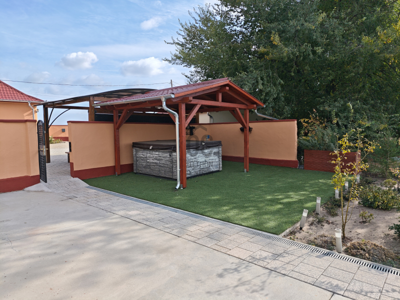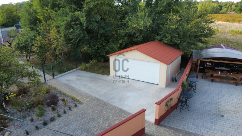 A telken 36 m²-es dupla garázs, külön grillterasz, jacuzzi, elektromos kapu és ipari áram található.