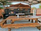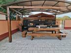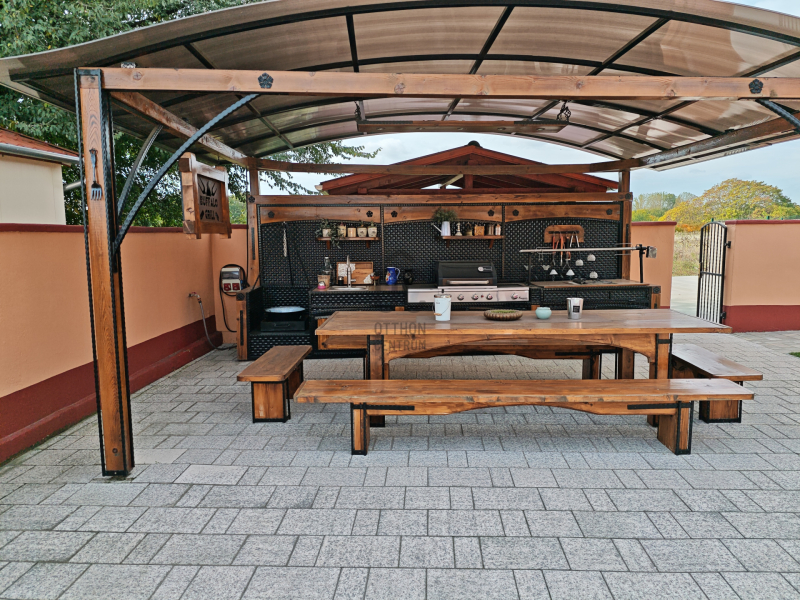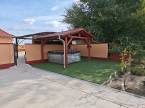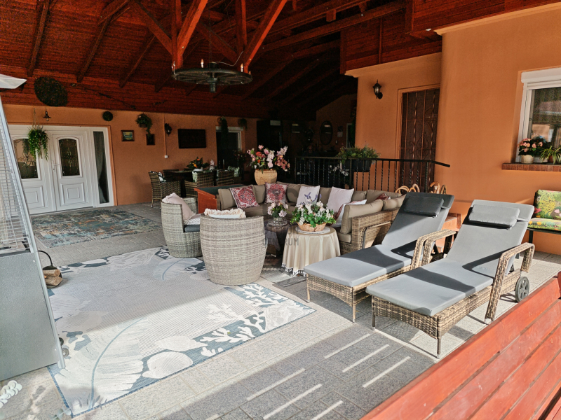 A lakóingatlanhoz egy több mint 70 m²-es fedett, térkövezett terasz tartozik tömör fa szerkezettel, amely kiválóan alkalmas pihenésre és közösségi térként is funkcionál.