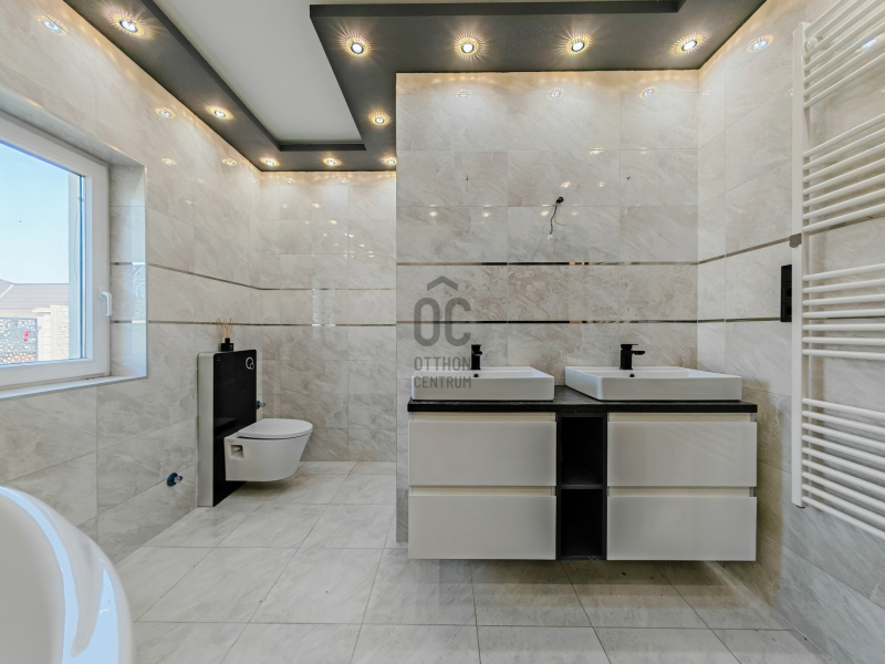 A dupla garázsba két autó és az udvaron még több kocsival lehet beállni. A ház hőszivattyús fűtése (padlófűtéssel) és hűtő-fűtő klíma biztosítja a kellemes hőmérsékletet az év minden szakában, így a komfortérzeted mindig garantált.