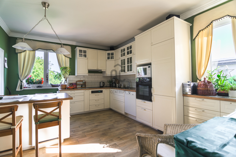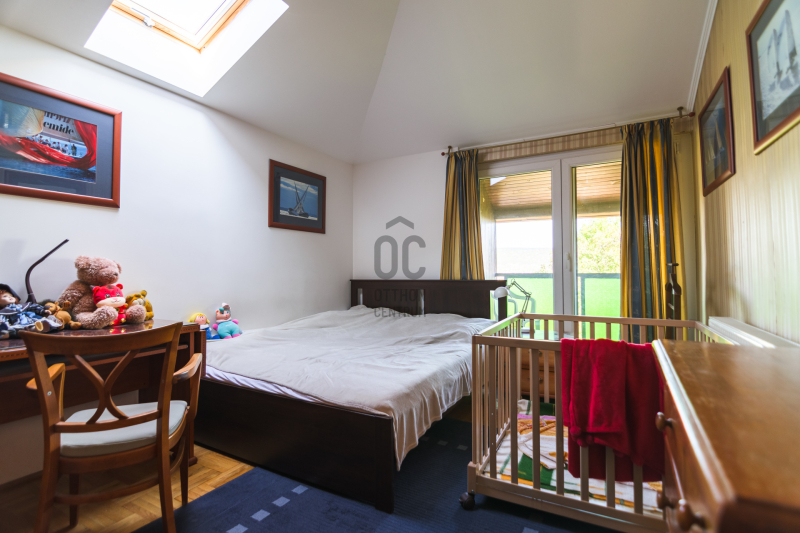 A modern polgári stílusú ház praktikus és tetszetős belső kialakítását lakberendezői tervek alapján kivitelezték. A földszinten ízléses, kandallós, hagyományos stílusú nappalit, hozzá kapcsolódó társalgót, modern, ikea berendezéssel rendelkező konyha-étkezőt, kamrát és hatalmas, nagy ablakos világos fürdőszobát találunk. Az emeleten négy nagy méretű hálószoba (ezekből kettő terasz-kapcsolatos), világos fürdőszoba, külön WC van. Az emeleti teraszról a budaörsi panorámában gyönyörködhetünk.