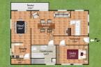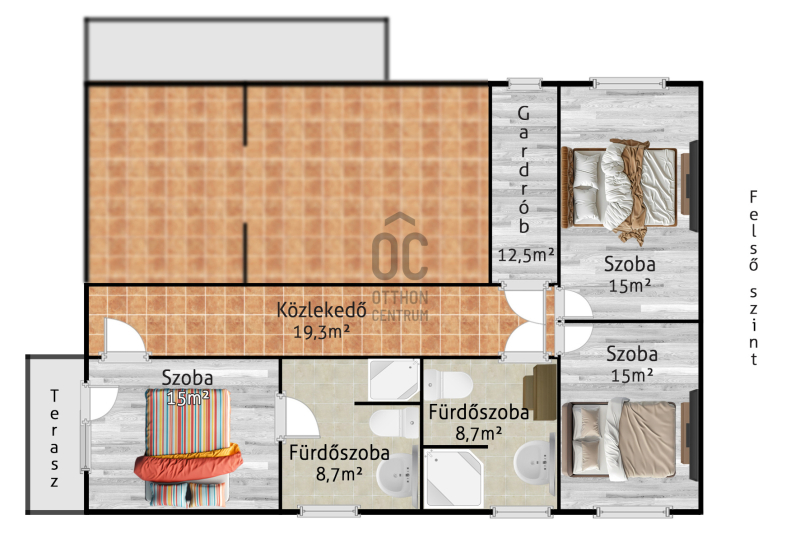 A felső szinten 3 hálószoba 2 fürdőszoba és egy gardróbkerült kialakításra.