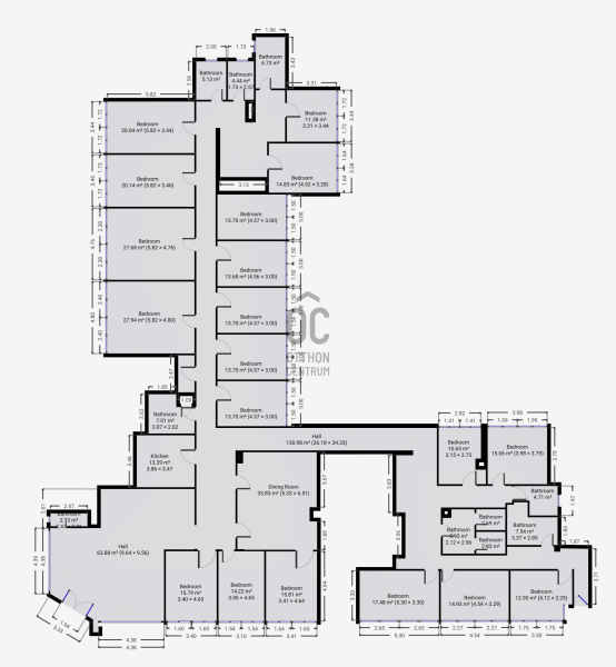 Az ingatlanban összesen 20 szoba található, különböző méretű (1-2-3 ágyas) szobákkal. A szállás rendelkezik 3 teljesen felszerelt konyhával, 12 zuhanyzóval, 6 fürdőszobával, közösségi helyiségekkel és recepcióval.