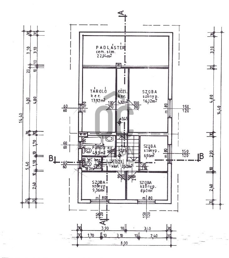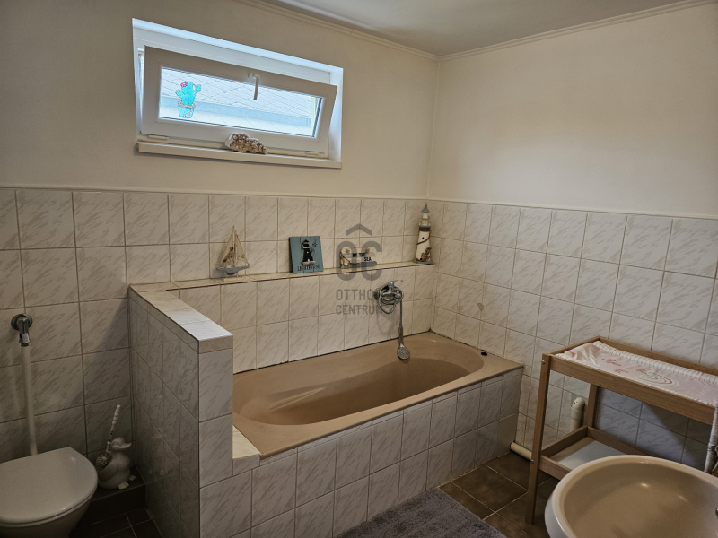 - Az emeleti részen további 2 fürdőszoba került kiépítésre, ezek közül az egyikben WC-kád-mosdó, a másikban zuhanyzó és mosdó került beépítésre.