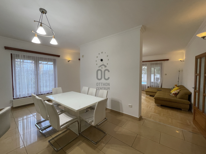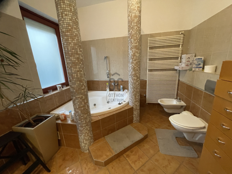 Helyiségei: hatalmas, világos, hangulatos konyha-étkező-nappali, 3 különnyíló szoba, 2 fürdőszoba (zuhanyzós és kádas), 2 wc, kamra, mosókonyha, gépészet, gardrób, dupla garázs.