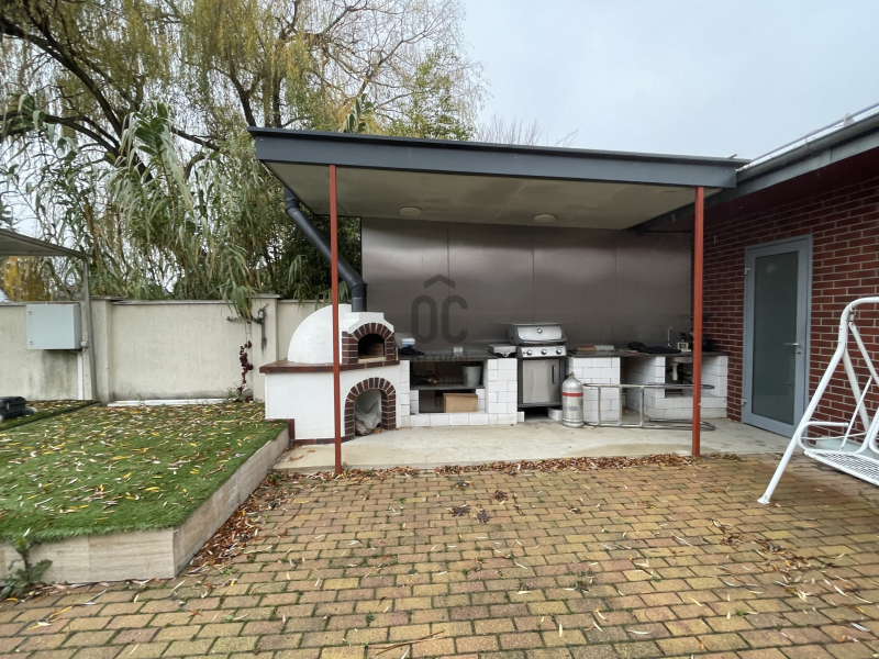 - a kertben megtalálható egy hőszivattyúval ellátott fűthető medence, továbbá egy fedett kültéri konyha kemencével, mosogatóval