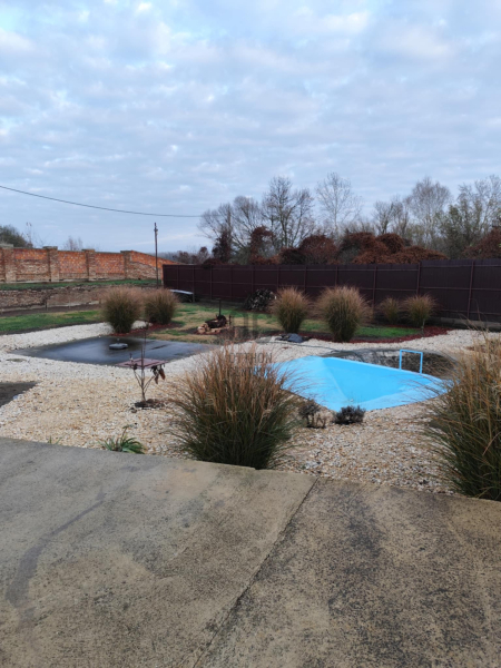 A területen található egy 85 nm-es ház, kettő tágas szobával, nagy nappali-étkező konyhával, valamint előszobával, fűrdőszobával, és klön WC-vel.