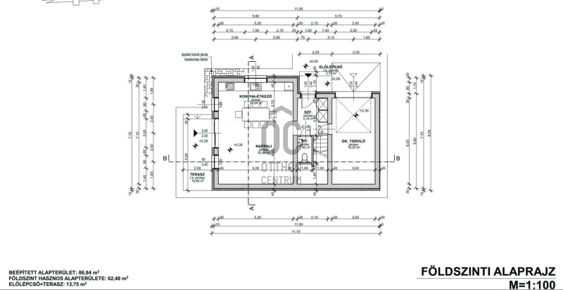 Fszt : konyha - étkező - nappali, wc , lépcső emeletre + garázs helyiségekből áll.