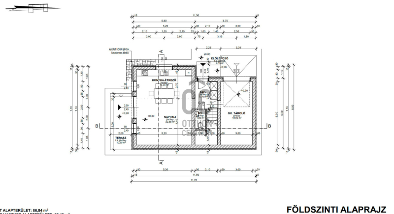 Földszint helyiségei : konyha - étkező - nappali, + terasz + garázs