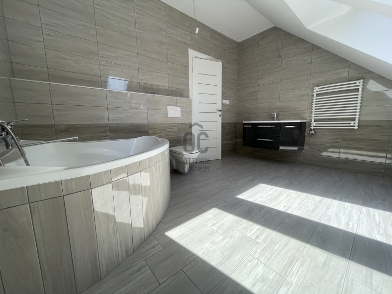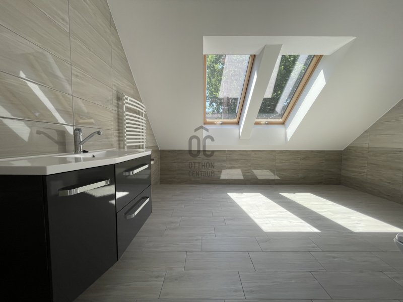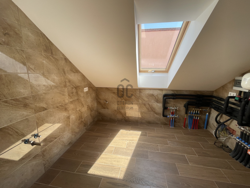 Emelet helyiségei: 2 hálószoba+ 1 gardrób, sarokkádas fürdőszoba WC- vel, gépészetnek kialakított helyiség mosókonyhával.