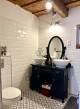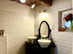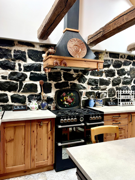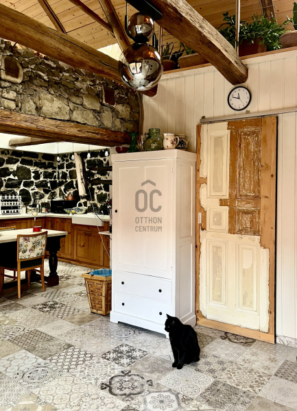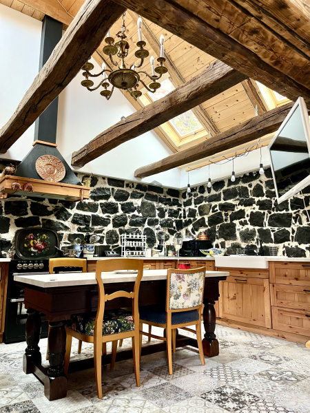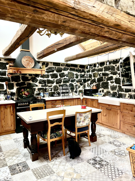 A ház egyik ékköve a nagy belmagasságú, tágas és világos, gépesített konyha-étkező, ahol az eredeti kő építőelemeket meghagyták az autentikus hangulat megtartása érdekében.