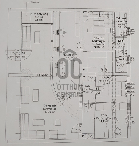 Belépve az ügyféltérbe jutunk, melyből nyílik a hátsó traktusban elhelyezkedő kis iroda, irattár, teakonyha és a vizesblokk.