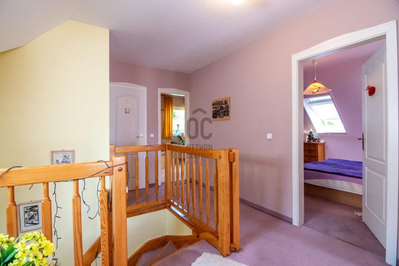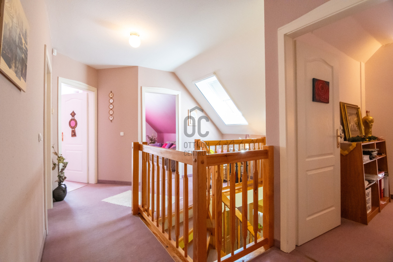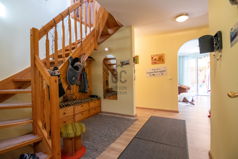 Eladásra kínálok Piliscsabán, a Csabagyöngye lakóparkban, az erdő nyugalmában egy belső kétszintes, nappali+ 5 hálószobás, 2 gardróbos, 2 fürdőszobás, külön és egybe wc-s, könnyűszerkezetes családi ház, mely sík, 900 nm-es telken helyezkedik el.