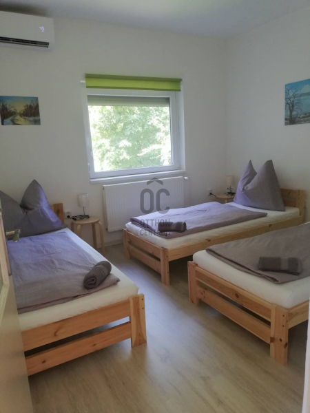 Helyiségei: Alsó szinten konyha, közlekedő, szoba, fürdő+WC, kazánház, plusz egy külön fürdő+WC, garázs. Összesen 70 négyzetméter.