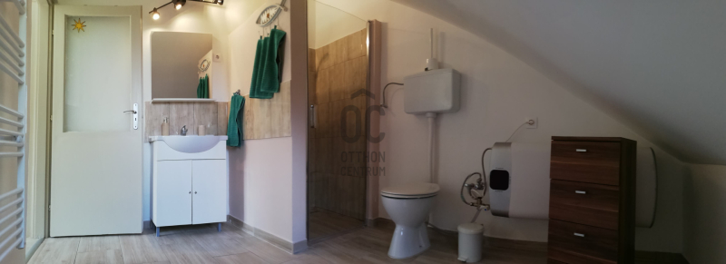 Felső szint 2020-ban teljesen felújítva: terasz, nappali–konyha-étkező, közlekedő, 2 szoba, fürdő+WC. Összesen: 80 négyzetméter