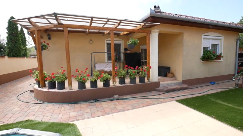 A 550 m²-es, gondosan parkosított telek igazi ékszerdoboz: a fedett teraszok, a beépített filagória, a bográcsozó és a kerti zuhanyzó tökéletes helyszínt kínálnak a családi és baráti összejövetelekhez, a saját gépészettel szerelt, fedhető 3x7 méteres medence pedig a nyári kikapcsolódás elengedhetetlen része. Az udvar műfűvel és térkővel borított, beépített tárolókkal praktikus megoldásokat nyújt, az automata öntözőrendszer pedig a virágok, évelő növények, vetemény és a termő barackfák gondozását könnyíti meg.