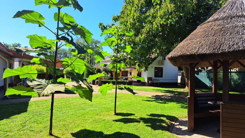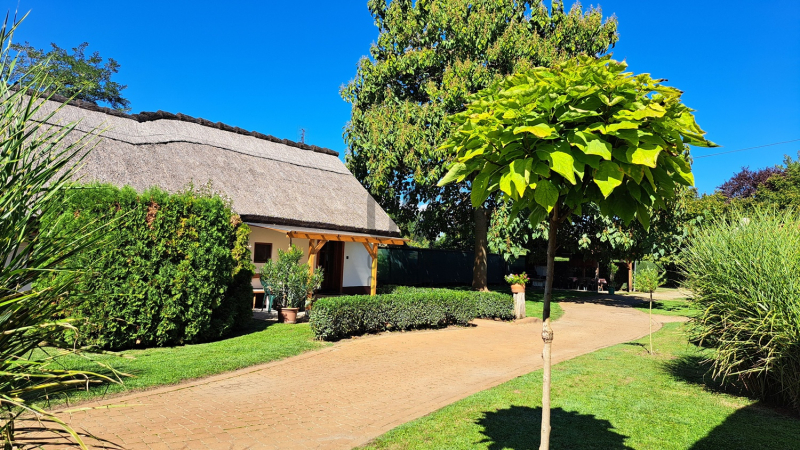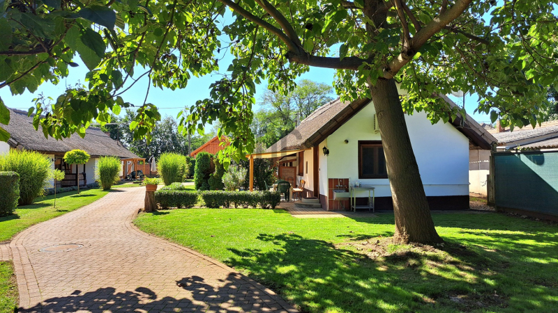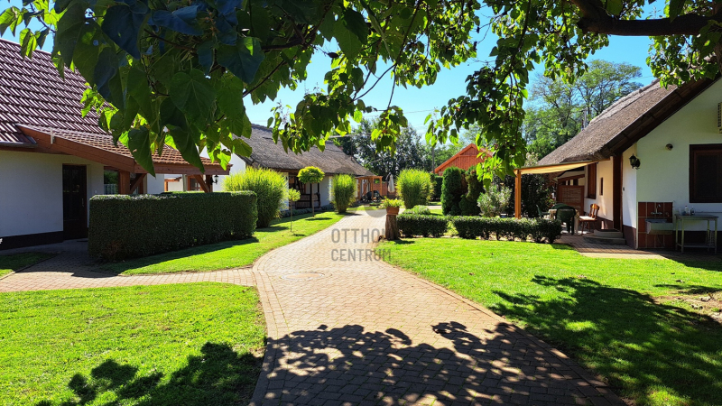 - Szálláshelyeknek kialakított klímás nádtetős parasztházak, egy parkosított udvaron helyezkednek el, A vendégek kényelmét szolgáló kiülők, teraszok, medence és egy hat állásos parkoló szolgálja. Ez a terület kb: 1.700m2