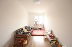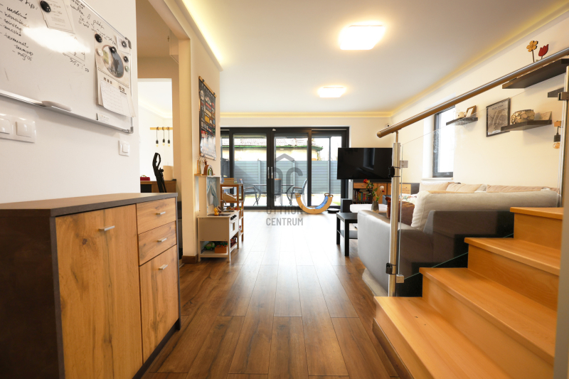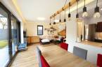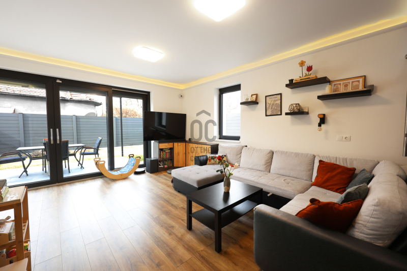 A tágas, világos nappalihoz közvetlenül kapcsolódik a 13 nm-es fedett terasz, melynek oldalai beüvegeztetése után egy téli/nyári kertet kaphatunk.