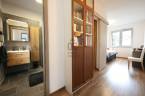 A tágas, világos nappalihoz közvetlenül kapcsolódik a 13 nm-es fedett terasz, melynek oldalai beüvegeztetése után egy téli/nyári kertet kaphatunk.