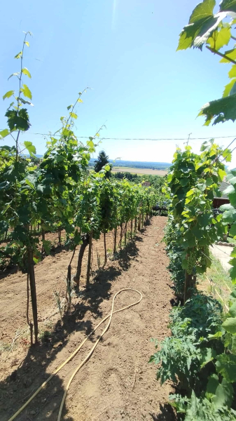 A területen gondosan karbantartott szőlőültetvény található: fele rizling, 35% Furmint, 15% Kékfrankos, átlagosan akár 1000 l bor termelésére alkalmas, évente fiatalítva friss telepítéssel.
