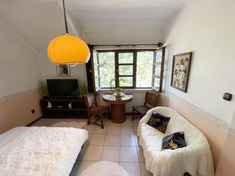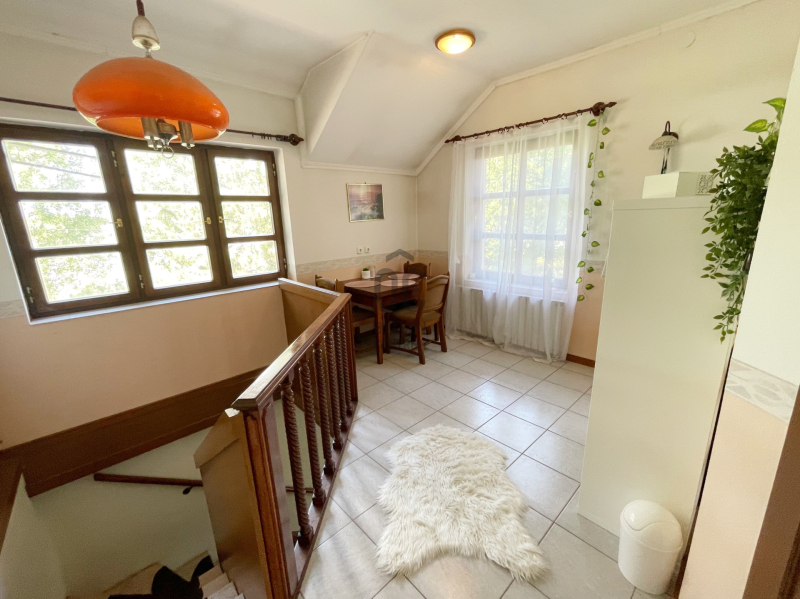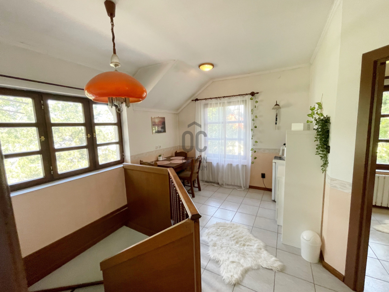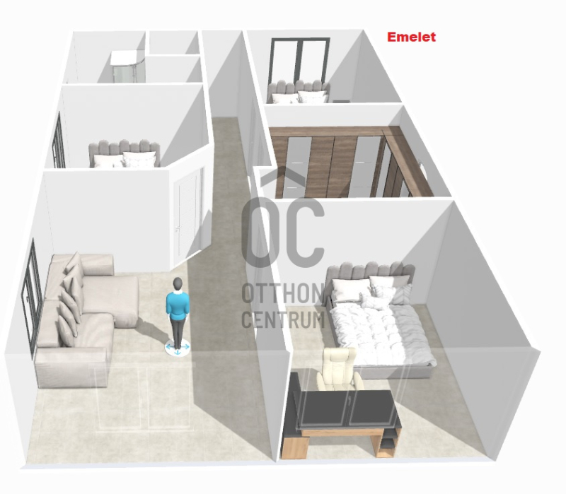 Az emeletre kényelmes lépcső vezet fel, ahol három hálószoba, gardrób, fürdőszoba és külön WC került kialakításra. Egy kisebb teakonyha is helyet kapott ezen a szinten, ami ideálissá teszi az ingatlant kétgenerációs otthonként való használatra is. A tetőtéri szobák mindegyikéből lenyűgöző panoráma nyílik a Dunára, így a természet közelségét minden évszakban élvezhetjük.