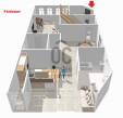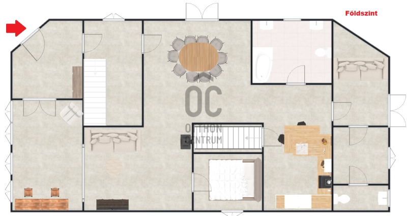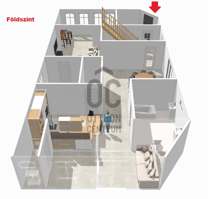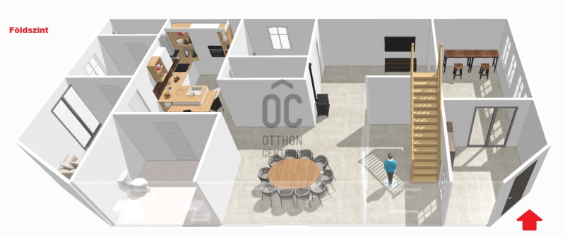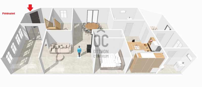 A földszinten egy napfényes, Dunára néző télikert kapcsolódik a tágas nappalihoz, mely harmonikus egységet alkot az étkezővel és a külön konyhával. Innen nyílik egy hálószoba vagy dolgozószoba, valamint egy sarokkádas fürdőszoba és egy külön vendégmosdó. A veranda kellemes, elvonulásra alkalmas tér, ahonnan a zöld kertre nyílik kilátás. A konyha alatt kis méretű pince biztosít tárolási lehetőséget.