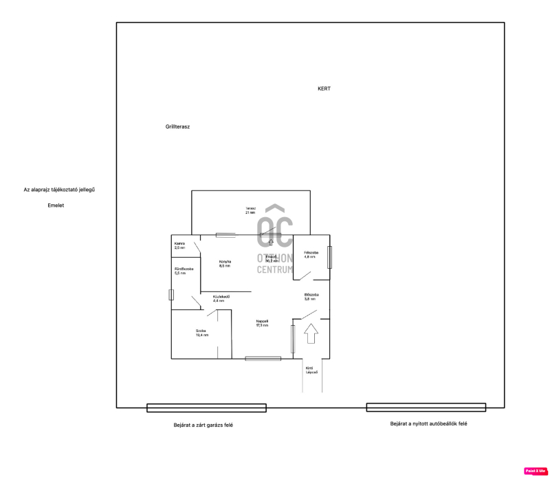 - Az emeleti lakótér kb. 84 m²-es (nappali + 1,5 szoba), nagyon jó elrendezésű