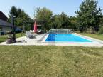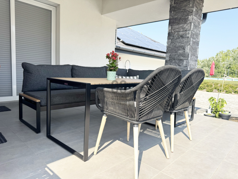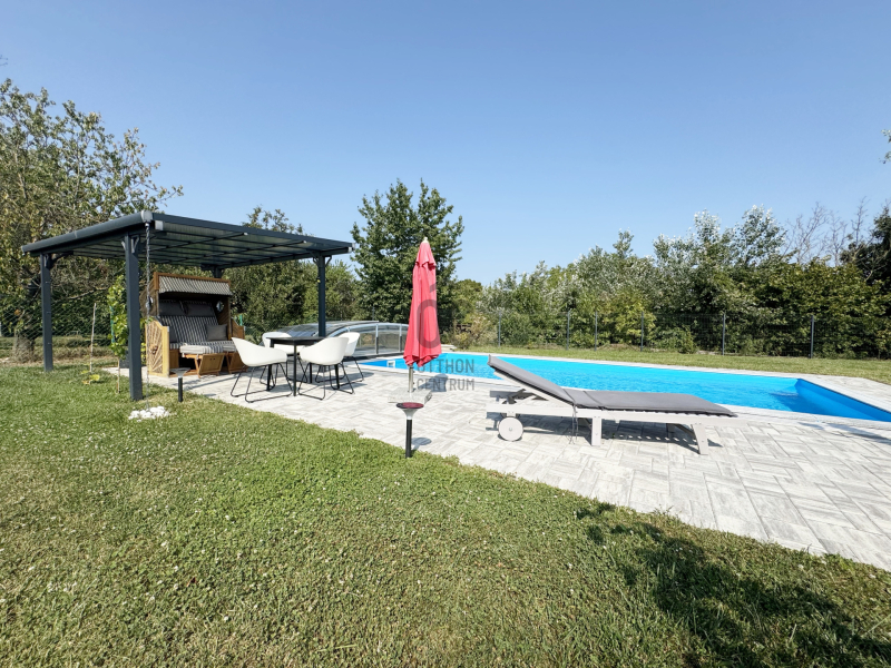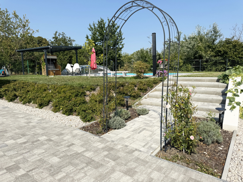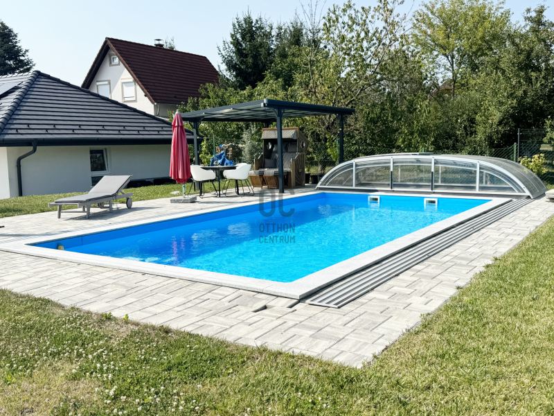 A gondozott kert központi éke a sós vizű, 6x4 méteres medence, amely nemcsak nyáron nyújt felfrissülést, hanem egy stílusos életteret is teremt.