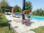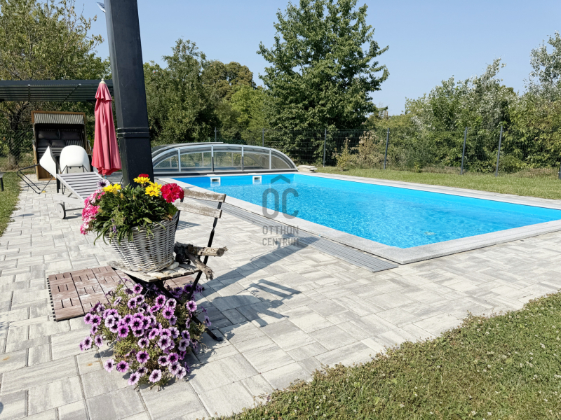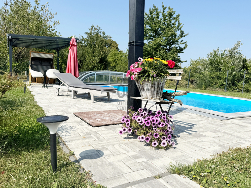 A gondozott kert központi éke a sós vizű, 6x4 méteres medence, amely nemcsak nyáron nyújt felfrissülést, hanem egy stílusos életteret is teremt.