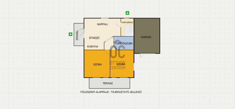 - Földszinten : 2db terasz , nappali - konyha - étkező , 2 db hálószoba , fürdőszoba , W.C. , lépcsőház.