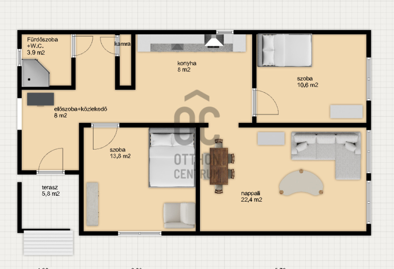 - 2 szoba+nappali-étkező, konyha, fürdőszoba+wc, előszoba