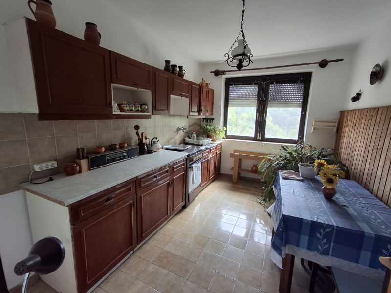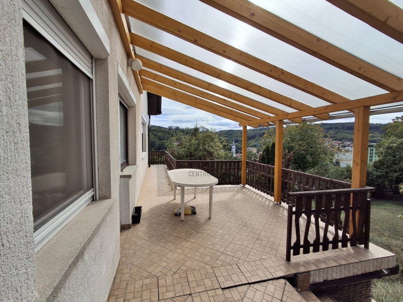 Zöld környezetben, örök panorámás kilátás a városra, belső 3 szintes családi ikerház . Az ingatlan 1990-ben épült, bruttó 336nm, teraszokkal, szintenként külön lakóegységként is használható. Jelenleg jó állapotú, de igény szerinti korszerűsíthető ikerház, (mely nincs összeépítve) Az alsó szint kívülről is megközelíthető, így alkalmas irodának, magánrendelőnek, vállalkozásnak. A ház szigetelése megfelelő, nyílászárói fa-műanyag ablakok, fűtése távfűtés valamint a földszinti nappaliban nagyon szép épített kandalló található. A telek mérete 1109nm, mely enyhén domboldal, egy része sík, kerti rendezvényekre kiválóan alkalmas. Az ingatlanhoz garázs, présház és borospince is tartozik.