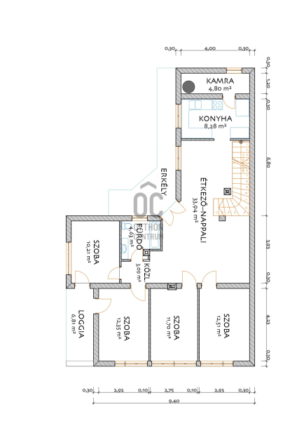 Nappali-étkező + 4 szoba + konyha+ fürdő-wc+ mosókonyha+ wc+ kamra+ utcára néző loggia