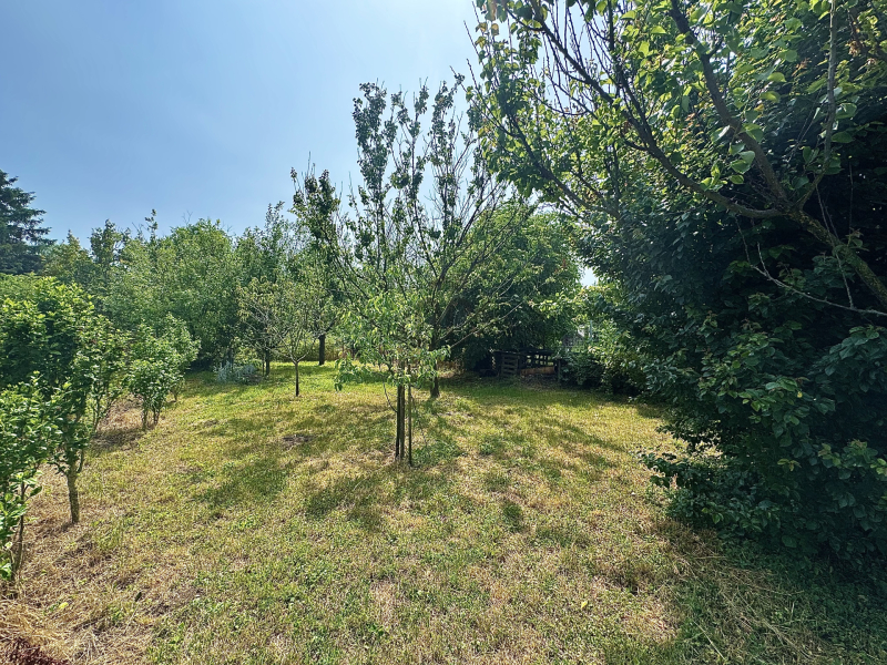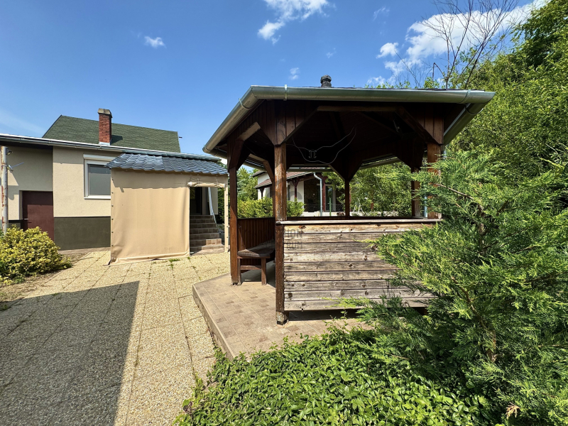 A kertben termő gyümölcsfák, nyári konyha, kerti pavilon található.