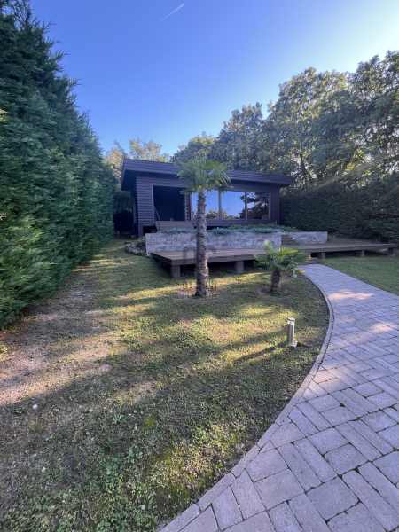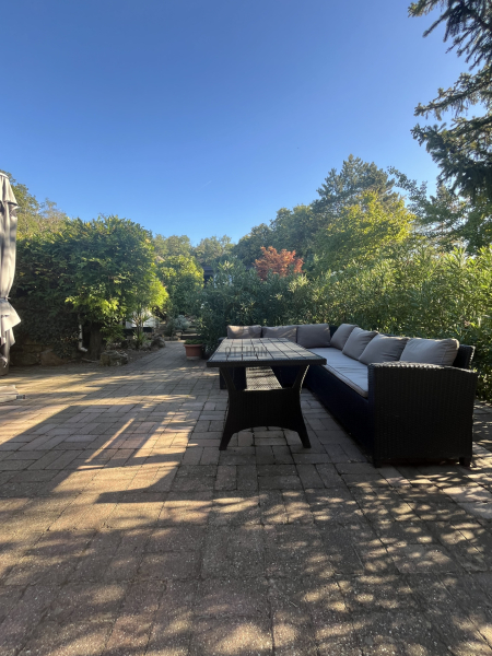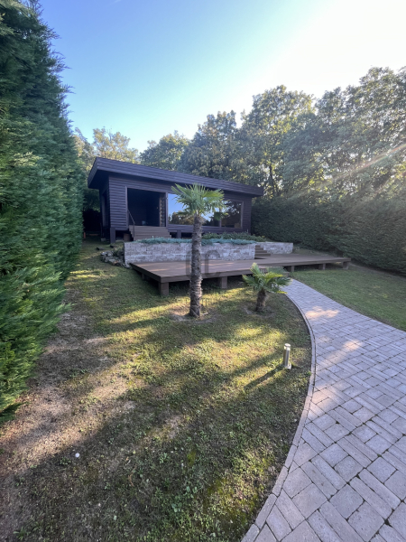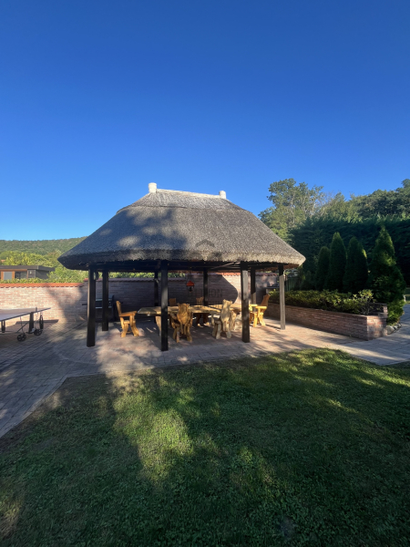 A kert szemet gyönyörködtető, az épület előtt kiépített teraszon helyett kapott egy jakuzzi, társalgásra alkalmas kiülő rész és sütögető helyiség.