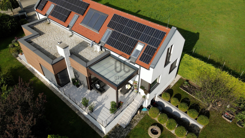 A melegről egy gáz-cirkó kazán gondoskodik padlófűtéssel. A villanyszámlát egy-az egyben fedezi a 9 kW teljesítményű napelem rendszer és még 7 évig szaldós elszámolás lesz. A 44 cm-es porotherm tégla 10 cm-es hungarocell szigetelést kapott.