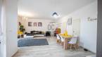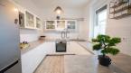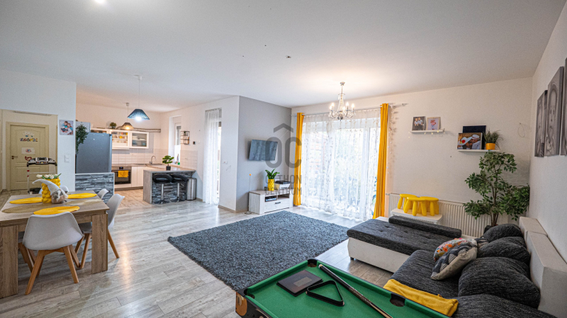A nagyméretű nappali-étkező a konyhával egy légtérben van, így a ház asszonya is könnyedén tud kapcsolódni a család többi tagjával főzés közben is.