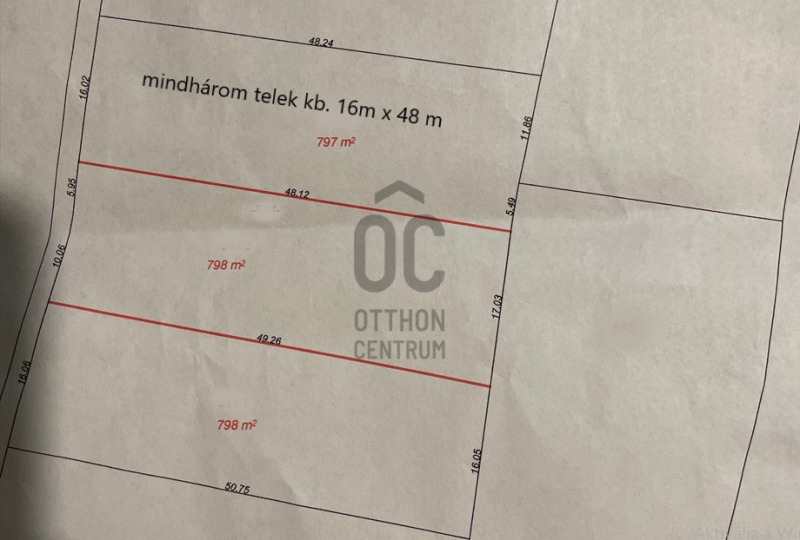 Ez a terület most épp átalakulóban van — a földhivatalnál már folyamatban a három részre osztás, és ha minden papír a helyére kerül, három különálló telek születik belőle, (797 m2, 798 m2, 798m2, mindhárom telek kb. 16 m x 48 m )