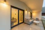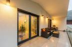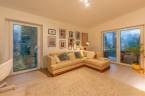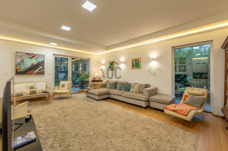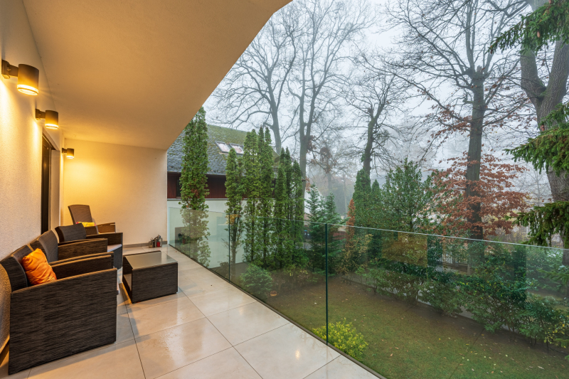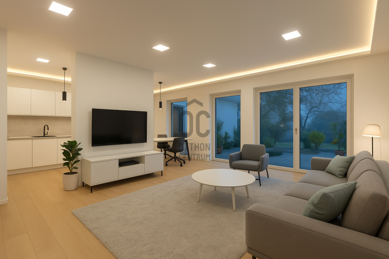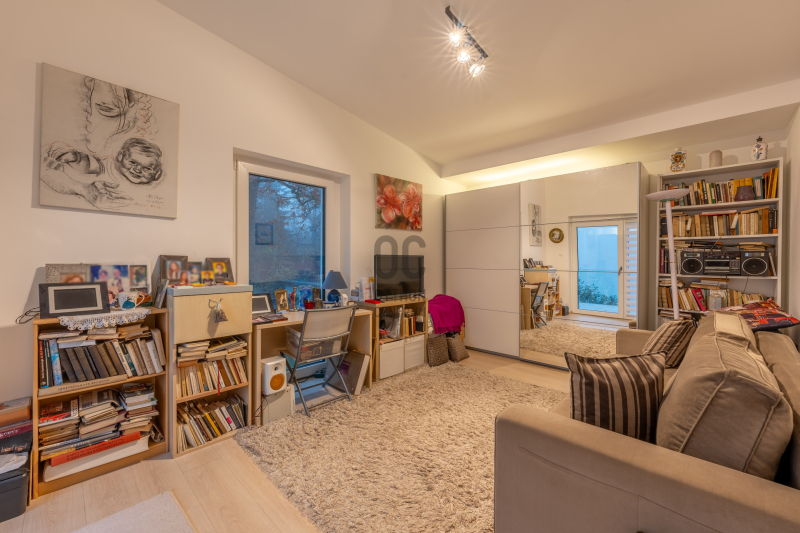 A nappali–konyha–étkező 50 m²-es, négy különnyíló hálószoba (16 m², 12 m², 18,7 m², 17 m²) és több terasz (25,4 m², 14 m², 16,2 m², 9 m²) tartozik hozzá, amelyek közvetlen kapcsolatot biztosítanak a kerttel.