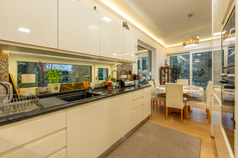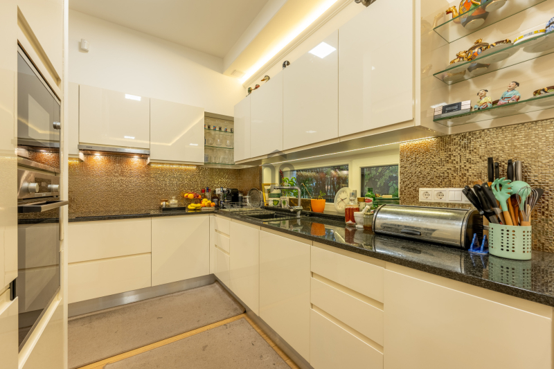 A konyhában magasfényű világos bútorok és beépített Bosch gépek találhatók.