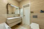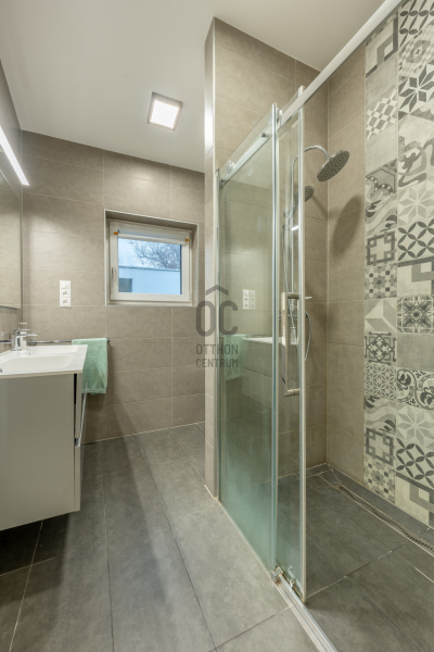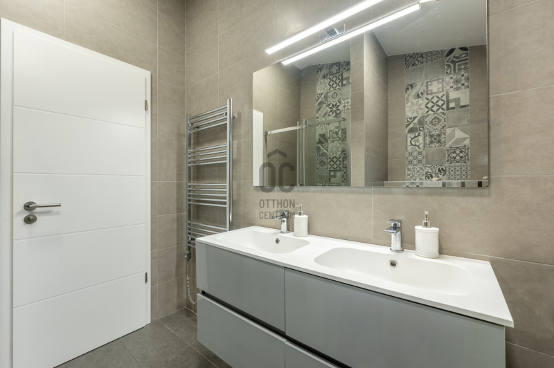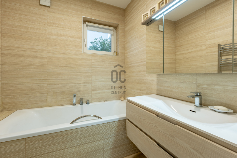 A belső terek természetes tölgyfa svédparkettával, a vizes helyiségek nagy méretű hidegburkolatokkal készültek.