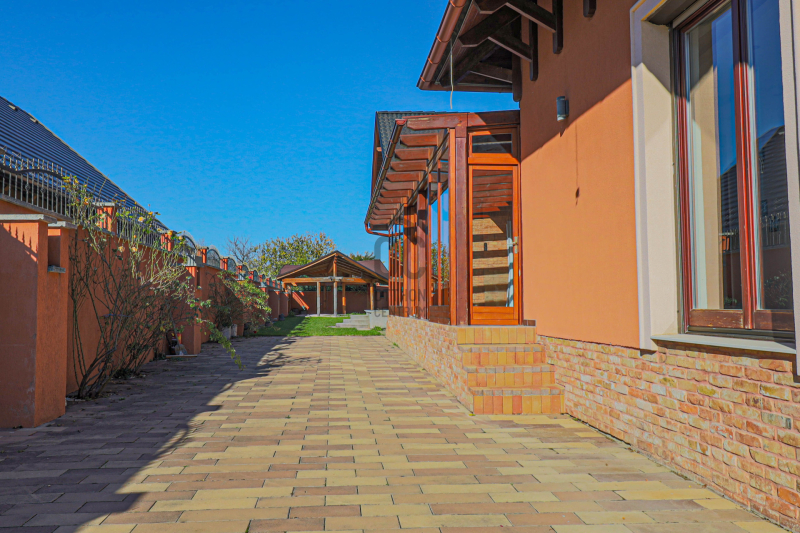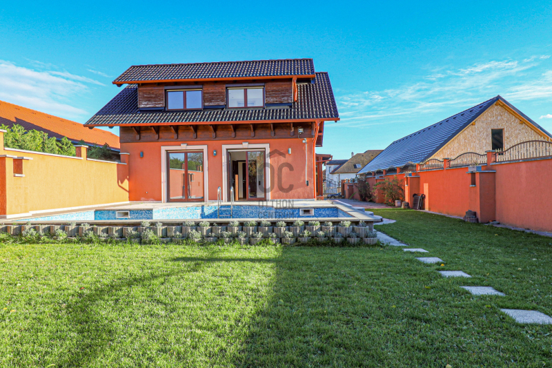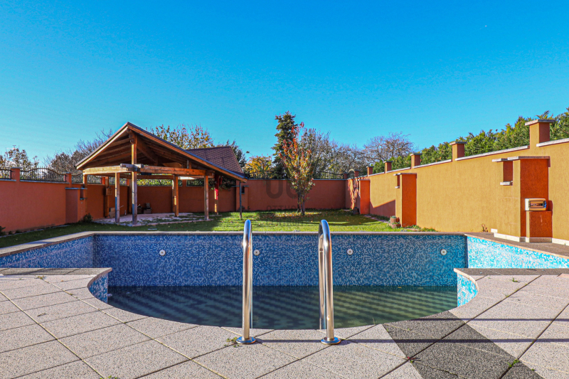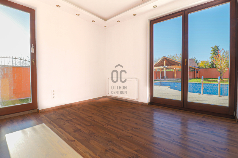 A gondozott udvarban medence, kerti kiülő és zöldövezeti nyugalom várja új tulajdonosát.