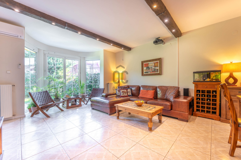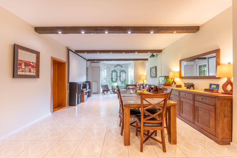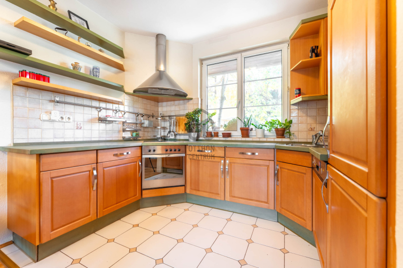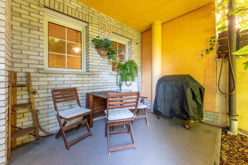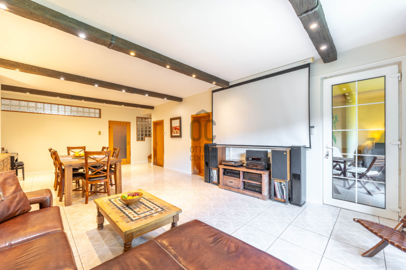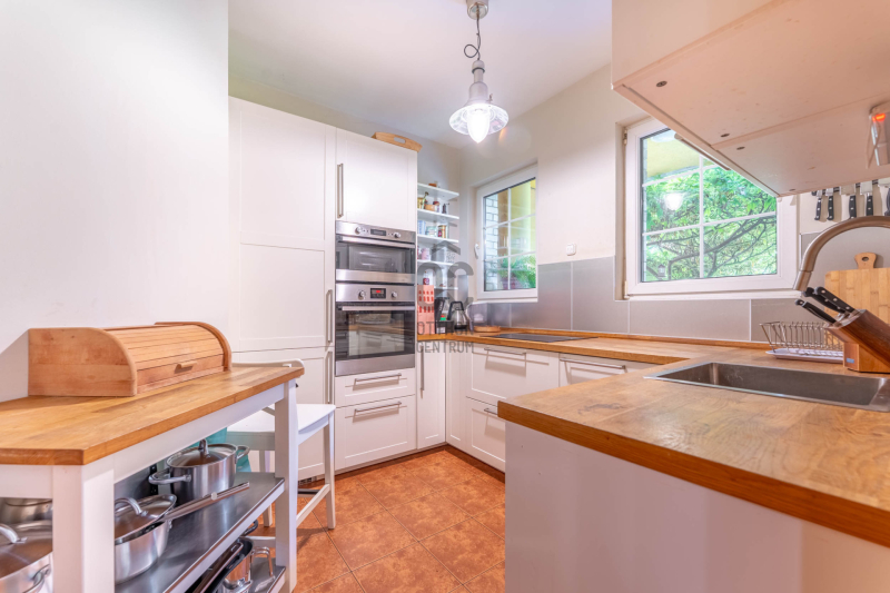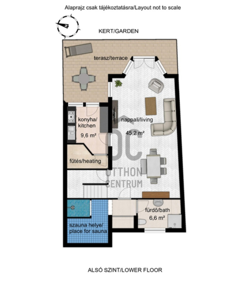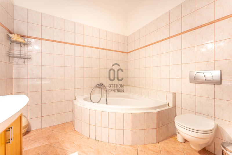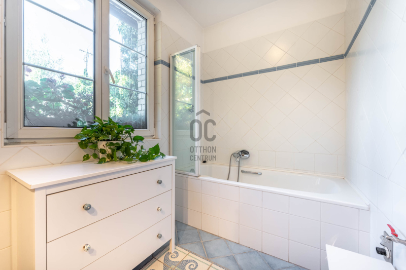 - a kert szinten tágas nappali étkezővel kertkapcsolatos terasszal, külön konyha, fürdő, hely a szaunának kiépített zuhannyal és kazánház/háztartási helyiség,