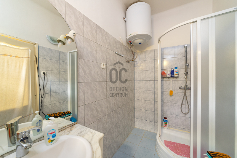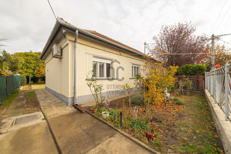 XVIII. kerületben a Béke tér környékén csendes mellékutcában, de kiváló közlekedéssel kínálunk megvásárlásra egy földszintes kialakítású ikerház felet. Klasszikus ikerház, a telek középen kerítéssel elválasztva, önálló utcai bejárat mindkét ikerfél lakói számára. A ház tégla építésű, cserép fedéses, belső elosztása tágas és kényelmes. A fedett teraszról nyílik a bejárat, egy jó méretű előszobából jutunk be a nagy méretű konyha-étkezőbe, innen két déli tájolású, világos szobát találunk, továbbá egy jó állapotú fürdőszoba, egy külön mellékhelyiség és egy belső lépcsőház is helyet kapott, innen közvetlenül juthatunk le a szuterén szinten lévő nagy garázsba. A házban kialakításra került még két szoba. A fűtést gázcirkó biztosítja, nyáron a kellemes hőmérsékletről két klíma gondoskodik. A telek 303 nm, a csatorna bekötése folyamatban van, február végére készen lesz. Telken belül több autóval is parkolhatunk, a garázsban további egy (kisebb) autó elfér, illetve van hely tárolásra is. A ház mögött egy kerti tároló is kialakításra került szerszámoknak, sporteszközöknek. Az utcai kapu elektromos. Csendes, családi házas mellékutca, a közelben (6 perc séta) több buszmegálló is megtalálható: 166, 236, 266, vonatállomás 5 perc séta, iskola, bevásárlási lehetőség, posta 5-10 percen belül gyalogosan elérhetők. Az ingatlan jogi háttere rendezett, rövid időn belül birtokba vehető.