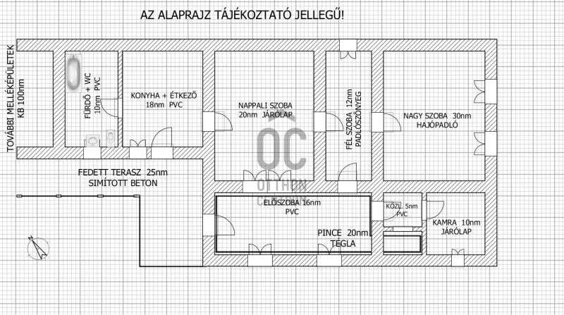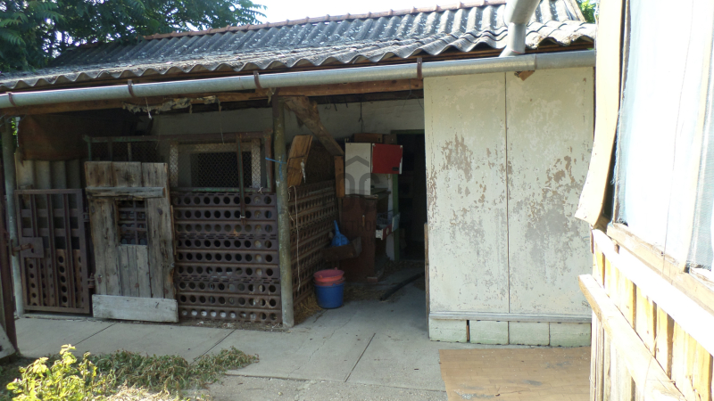 A telek nem nagy, így az építési vonalon végig nyúlik a melléképület, melyben tárolók, állattartásra alkalmas ólak találhatók. Mivel sarki telek, így előnye, hogy a porta két irányból is megközelíthető.