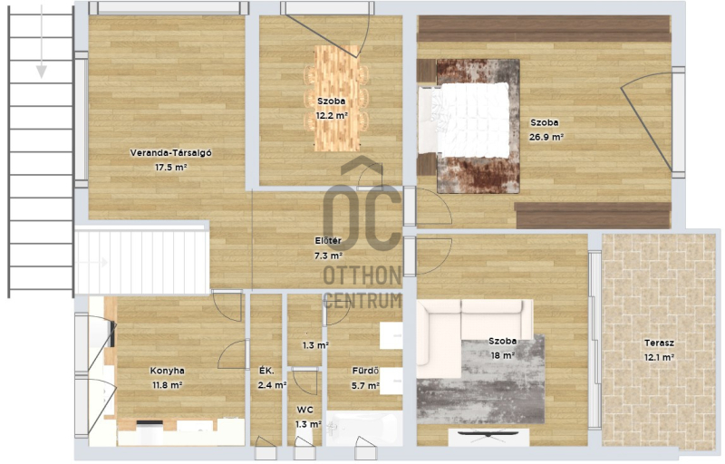 A házhoz tartozó 20 nm-es terasz ideális hely a nyári estéken való pihenéshez, ahol a gyönyörű panorámában gyönyörködhet, és élvezheti a természet közelségét.