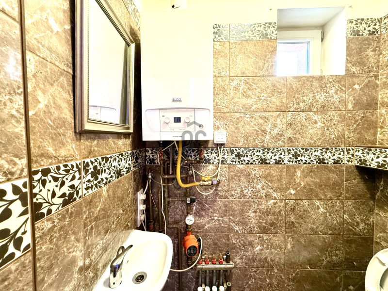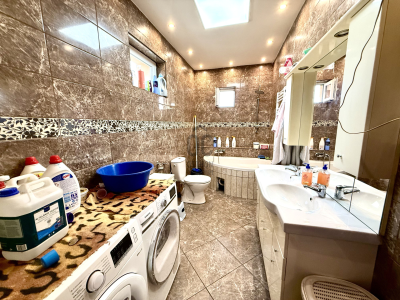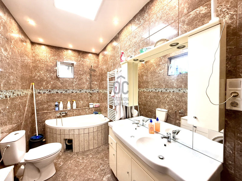 A ház 30-as Porothermből épült újra, 15 cm-es homlokzati szigeteléssel és 20 cm-es födémszigeteléssel kiegészítve. A belső terekben minőségi olasz burkolatok, gondosan megtervezett terek és korszerű gépészet várja a leendő tulajdonost. A fűtést Baxi gázcirkó, a hűtést inverteres klíma biztosítja, a nappaliban és fürdőben padlófűtéssel kiegészítve.