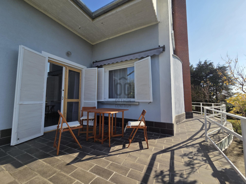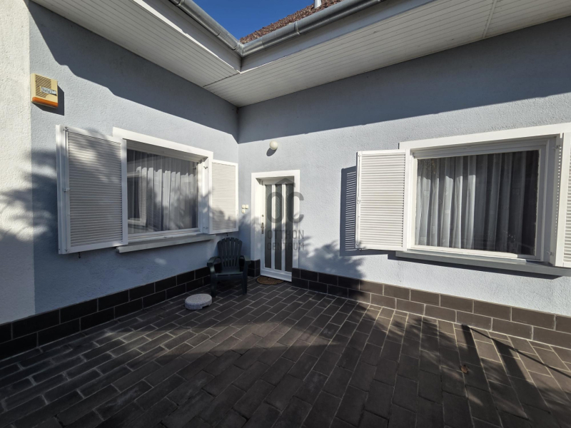 Az udvar szépen parkosított, intimitását a telket körülölelő sövényfal adja. Számos gyümölcsfa és örökzöld biztosítja az árnyékot a melegebb nyári napokon. Az udvar méretéből adódóan bőven jut hely még gyermekjátszótérnek, medencének, vagy nyári konyhának.
